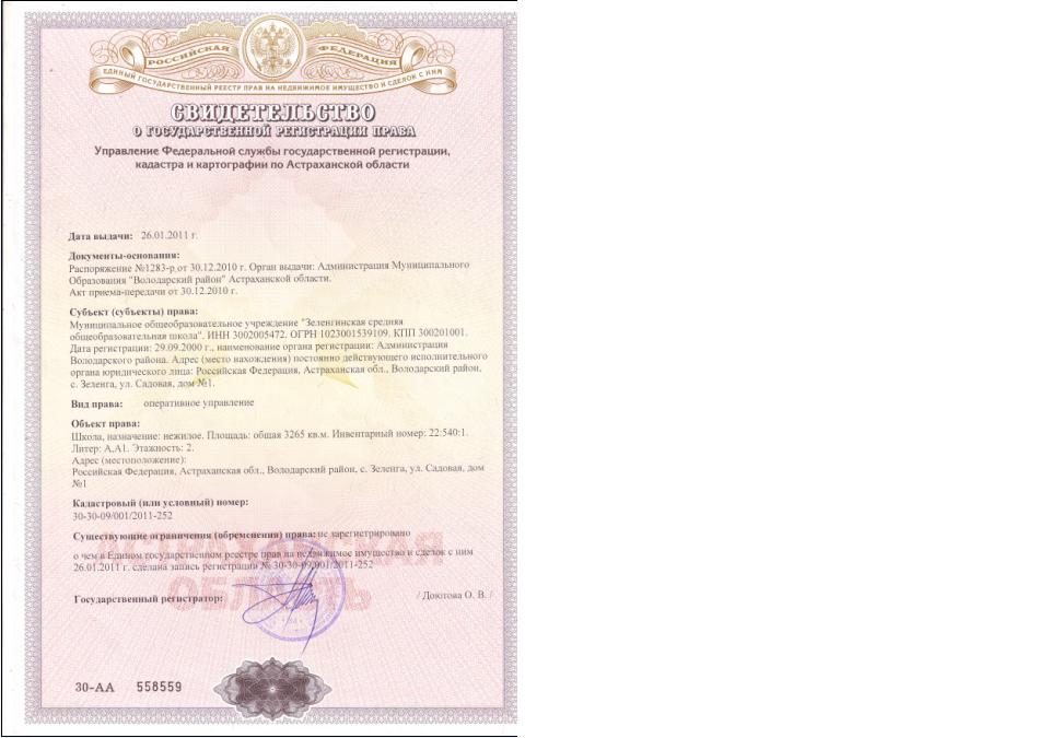 Свидетельство о регистрации права на школу.